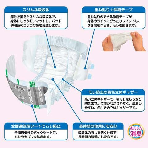 ●スリム吸収シート。おむつの厚みをおさえてスリム化。パッド併用時のゴワゴワ感をカットし、すっきりとした装着が可能です。