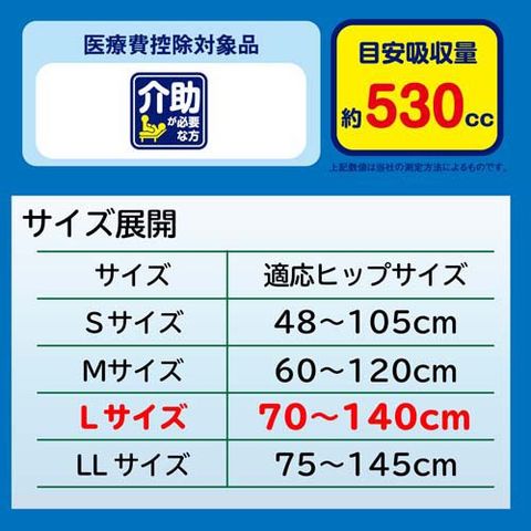 | ヒップサイズ:70~140cm 目安吸収量:約530cc 吸収回数の目安:排尿約3.5回分(1回の排尿量150mlとして) 対象:男女共用 医療費控除対象商品表面材:ポリオレフィン系不織布 吸水材:綿状パルプ/吸収紙/高分子吸水材 防水材:ポリエチレンラミネート不織布 止着材:ポリプロピレン 伸縮材:ポリウレタン 結合材:スチレン系エラストマー合成樹脂 |