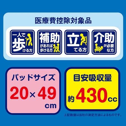 | おむつサイズ:20×49cm 目安吸収量:約430cc 医療費控除対象商品 吸収回数の目安:排尿約3回分(1回の排尿量150mlとして) 対象:男女共用表面材:ポリオレフィン系不織布 吸水材:綿状パルプ/吸収紙/高分子吸水材 防水材:ポリエチレンラミネート不織布 伸縮材:ポリウレタン 結合材:スチレン系エラストマー合成樹脂 |