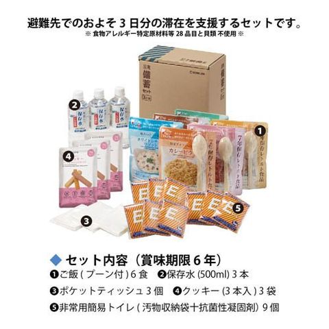 | ご飯(スプーン付)×6食(わかめご飯/五目ごはん/カレーピラフ/コーンピラフ/トマトリゾット/ホワイトシチューリゾット×各1食) 保存水(500ml)×3本 ポケットティッシュ×3個 クッキー(3本入)×3袋 非常用簡易トイレ(汚物収納袋+抗菌性凝固剤)×9個 ※食物アレルギー特定原材料等28品目と貝類不使用 ※ハラール認証取得 |