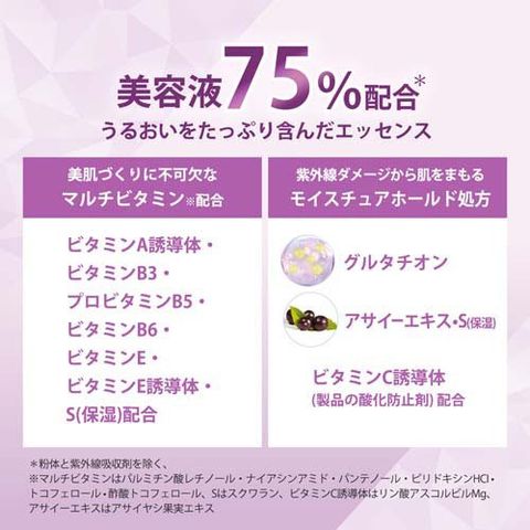 | 水、エタノール、メトキシケイヒ酸エチルヘキシル、安息香酸アルキル(C12-15)、BG、ジ(カプリル酸/カプリン酸)PG、エチルヘキシルトリアゾン、ビスエチルヘキシルオキシフェノールメトキシフェニルトリアジン、ジエチルアミノヒドロキシベンゾイル安息香酸ヘキシル、シリカ、イソドデカン、DPG、サリチル酸エチルヘキシル、アサイヤシ果実エキス、グルタチオン、トコフェロール、ナイアシンアミド、パルミチン酸レチノール、パンテノール、ピリドキシンHCl、リン酸アスコルビルMg、酢酸トコフェロール、BHT、PEG-10水添ヒマシ油、TEA、(アクリレーツ/アクリル酸アルキル(C10-30))クロスポリマー、(アクリレーツ/メタクリル酸ベヘネス-25)コポリマー、(アクリロイルジメチルタウリンアンモニウム/メタクリル酸ベヘネス-25)クロスポリマー、(ジメチコン/フェニルビニルジメチコン)クロスポリマー、カルボマー、キサンタンガム、コーン油、ジフェニルシロキシフェニルトリメチコン、スクワラン、ステアリン酸イヌリン、ステアリン酸ポリグリセリル-10、トリメチルシロキシケイ酸、合成フルオロフロゴパイト、酸化スズ、香料、マイカ、酸化チタン、青1、赤227 |