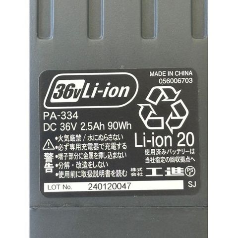 | 本体サイズ(mm):奥行500×幅600×高さ640 本体重量(kg):18.3 タンク容量:25L 吐出ホース:6mm×20m ポンプ:水平一連差動ピストン式 最高圧力:締切3.5MPa(35キロ圧) 最大吸水量:2.8L/分 噴霧量(高圧時):噴霧2.0L/分 直射2.3L/分 噴霧量目安:噴霧120L(タンク約5杯分) 直射138L(タンク約5.5杯分) モーター:ブラシモーター 定格電圧:DC36V 出力:250W 定格電流:5A 絶縁種類:E種 バッテリー:リチウムイオンDC36V2.5Ah×2個 充電時間:90分 運転時間:約60分(2個使用時) 使用環境温度:5-40度 |