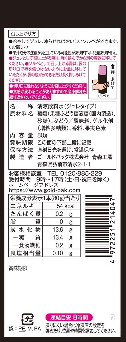| 糖類(果糖ぶどう糖液糖(国内製造)、砂糖)、ぶどう/酸味料、ゲル化剤(増粘多糖類)、香料、果実色素 |