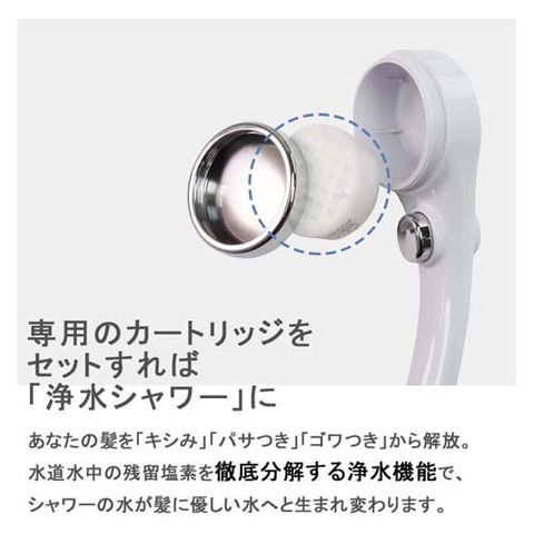 水道水中の残留塩素を徹底分解する浄水機能で、シャワーの水が髪にやさしい水へと生まれ変わります。