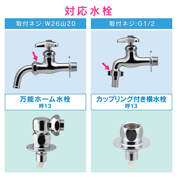 | 対応水栓・・・万能ホーム水栓/呼13(取付ネジW26山20)・カップリング付き横水栓/呼13(取付ネジG1/2) 使用温度・・・1~50度 使用圧力・・・0.05~0.75MPa 使用流体・・・上水道水 |