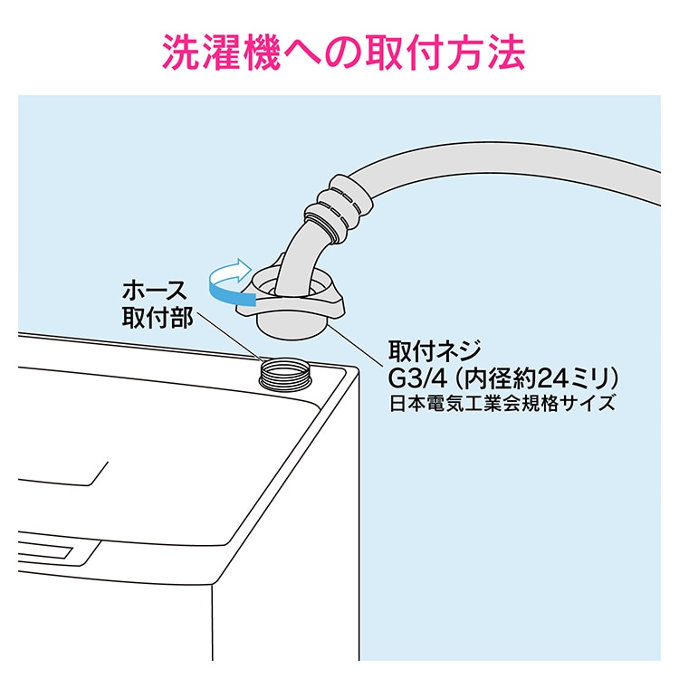 | ホース長・・・0.8m 洗濯機側取付ネジ・・・G3/4(内径約24mm)日本電機工業会規格サイズ 使用圧力・・・0.05~0.75MPa 使用温度・・・1~50度 使用流体・・・上水道水 |