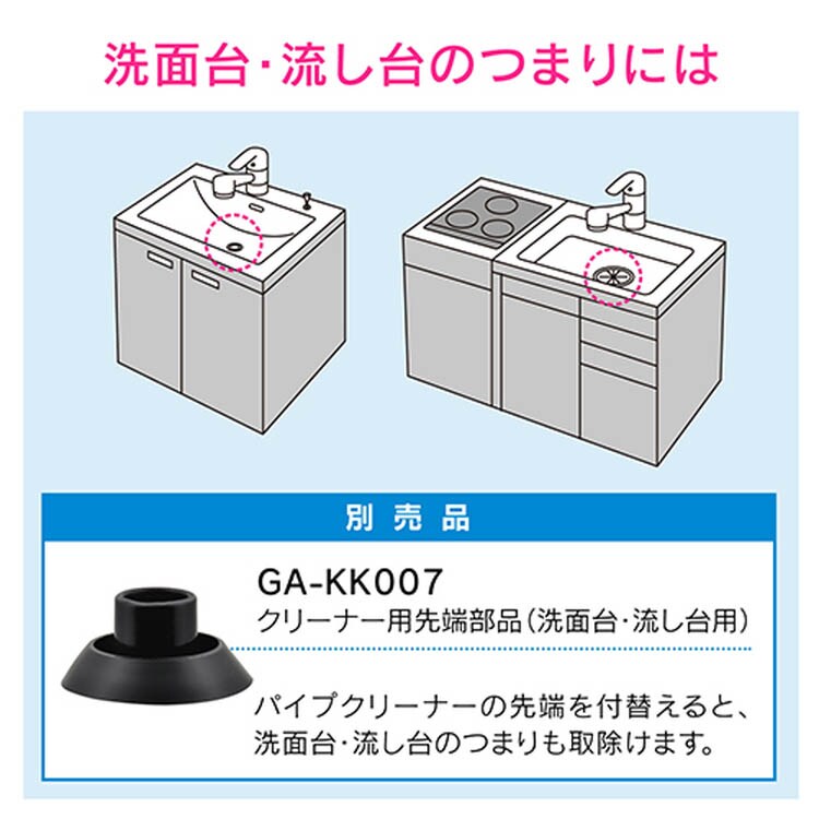 | 全長:418.5~587.5mm。対応ドレンホース:内径14mm・内径16mm。トイレ・浴室排水口用別売先端パーツ:GA-KK006。洗面台・流し台用別売先端パーツ:GA-KK007。【材質】本体:ポリプロピレン・塩化ビニル樹脂。ソケット:ABS樹脂。 |