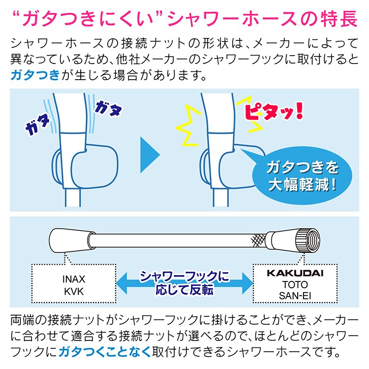 ●ほとんどのメーカーのシャワーフックとのガタつきを軽減するシャワーホースです。