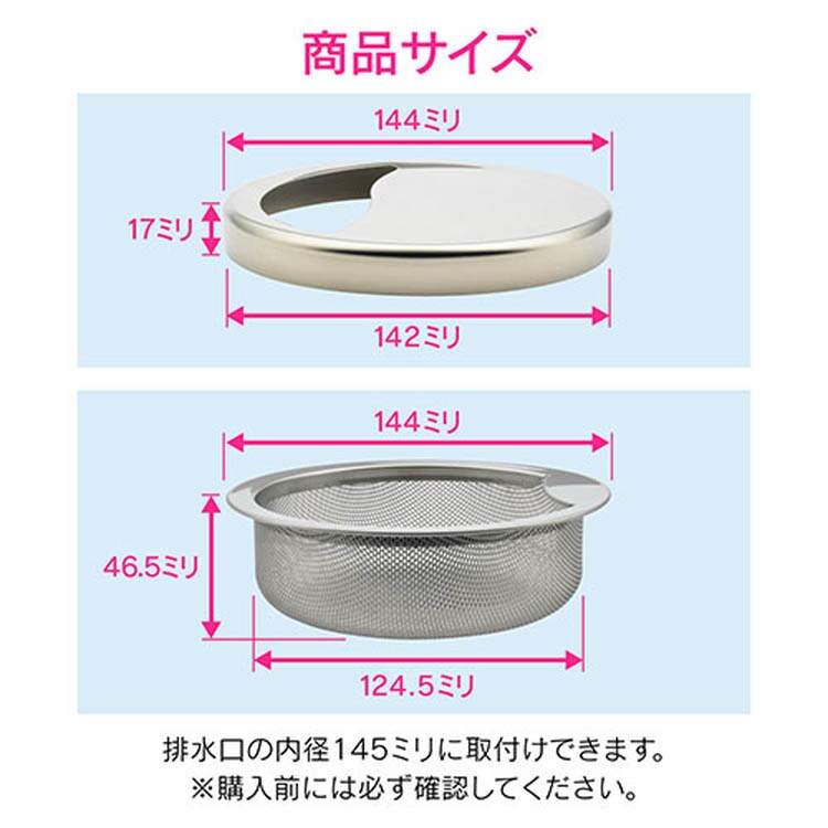 | 排水プレート外寸:直径144mm×高さ17mm。浅型ゴミカゴ外寸:直径144mm×高さ46.5mm。取付可能排水口内径:145mm(購入前にはサイズを必ず確認してください)。使用温度:1~60度C。【材質】ステンレス。 |