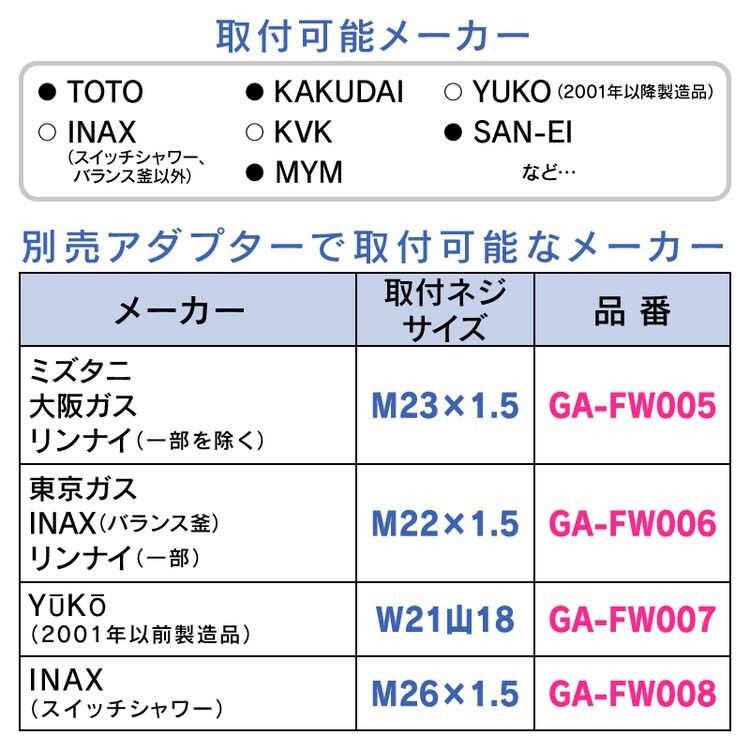| 色・・・ホワイト 使用温度・・・1~60度 使用圧力・・・0.05~0.75MPa 使用流体・・・上水道水 アダプター無しで取付可能(取付ネジサイズG1/2)・・・KAKUDAIINAX(スイッチシャワー、バランス釜以外) アダプター無しで取付可能(取付ネジサイズG1/2)・・・MYMSAN-EIYuKo(2001年以降製造品) 付属のアダプターで取り付け可能・・・KVK(M22*2)TOTO細ホース(W19山24)TOTO太ホース(W24山20)TOTO樹脂エルボ(M24*1.5) 別売アダプタで取付可能・・・GA-FW005(大阪ガスリンナイ(一部除く)ミズタニ)GA-FW006(東京ガスINAX(バランス釜)リンナイ(一部))GA-FW007(YuKo(2001年以前製造))GA-FW008(INAX(スイッチシャワー)) |