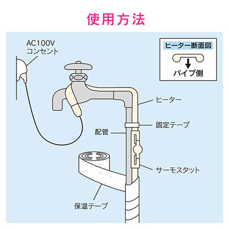 ●給水管の凍結防止。●外気温や配管径に合わせて、ヒーターを巻付ける寒波対策の必需品です。●管温度約3度Cで通電開始し、約10度Cで停止します。