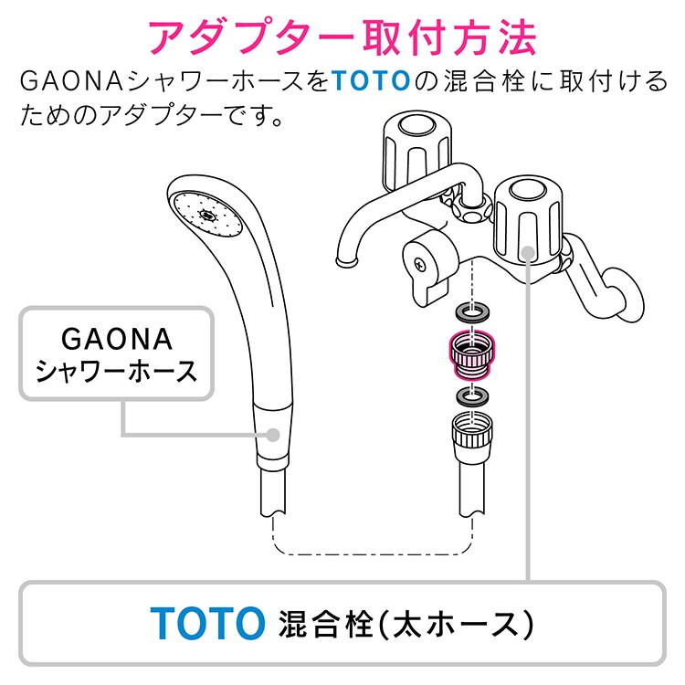 ●機能:GAONA・KAKUDAIなどのG1/2ネジを持つシャワーホースとTOTOの混合栓(太ホース用)を接続するアダプターです。