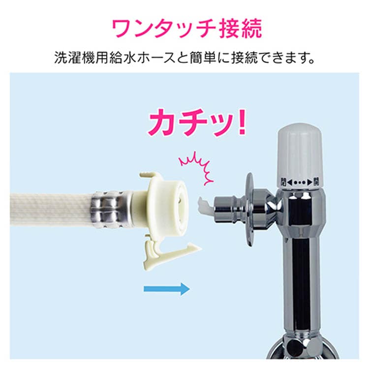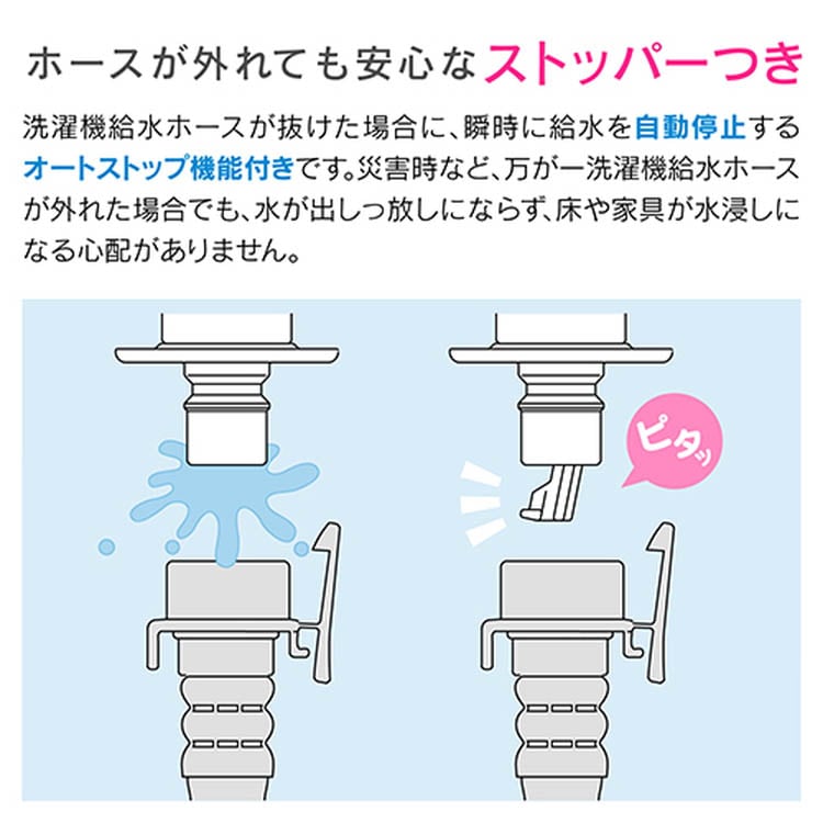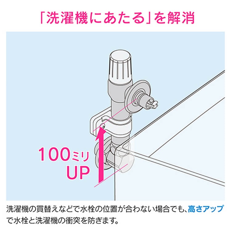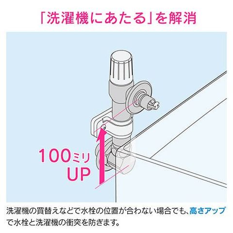 ●洗濯機給水ホースをそのまま接続できる単水栓。●洗濯機の買い替えや嵩上げなどで水栓の位置が合わなくなったときに使用します。●通常の水栓と比べて水栓位置を100ミリアップし、洗濯機本体との干渉を解消します。●自動閉止機構(ストッパー)付きのため、万が一ホースが外れた場合でも瞬時に給水を停止します。●ほとんどのメーカーの給水ホースが取付可能です。