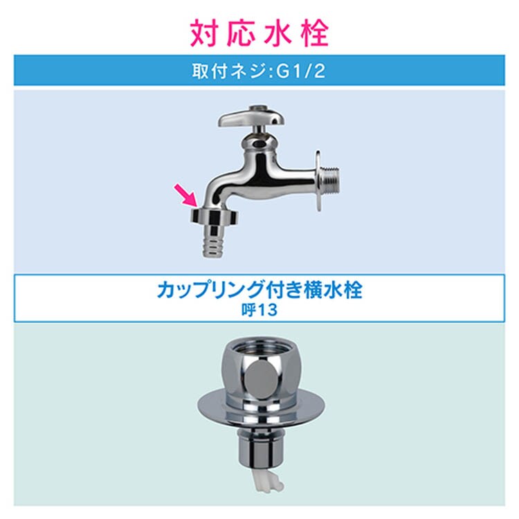 ●水栓と洗濯機給水ホースをワンタッチで接続できるニップル。●呼び13のカップリング付水栓に取付できます。●自動閉止機構(ストッパー)付きのため、万が一ホースが外れた場合でも瞬時に給水を停止します。●ほとんどのメーカーの給水ホースが取付可能です。