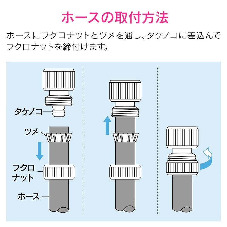 ●メタルホーセンドは内径11~15ミリ、外径16~20ミリのホースに取付けでき、ネジ口金に差込むだけでワンタッチで接続できます。
