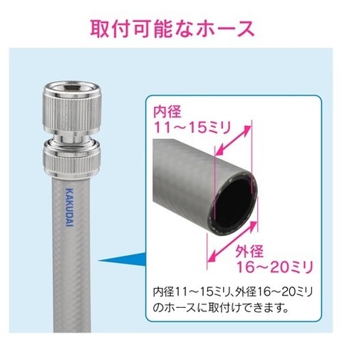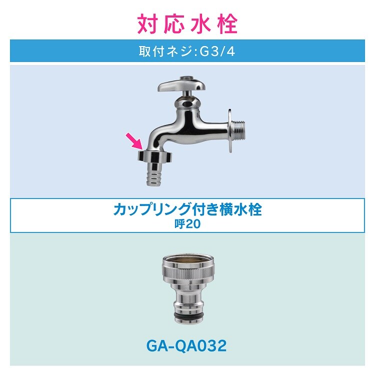 | ・口金適合水栓:呼20のカップリング付水栓(取付対応ネジG3/4) ・ホーセンド対応ホース:内径11~15mm・外径16~20mm ・流路内径:9mm ・使用圧力:0.05~0.6MPa |