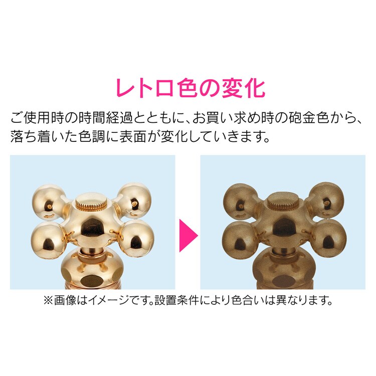 | ・給水金具:呼13(取付ネジPJ1/2)。 ・固定コマ仕様。 ・色:レトロ。一般地・寒冷地共用仕様。 ・材質:青銅。 |