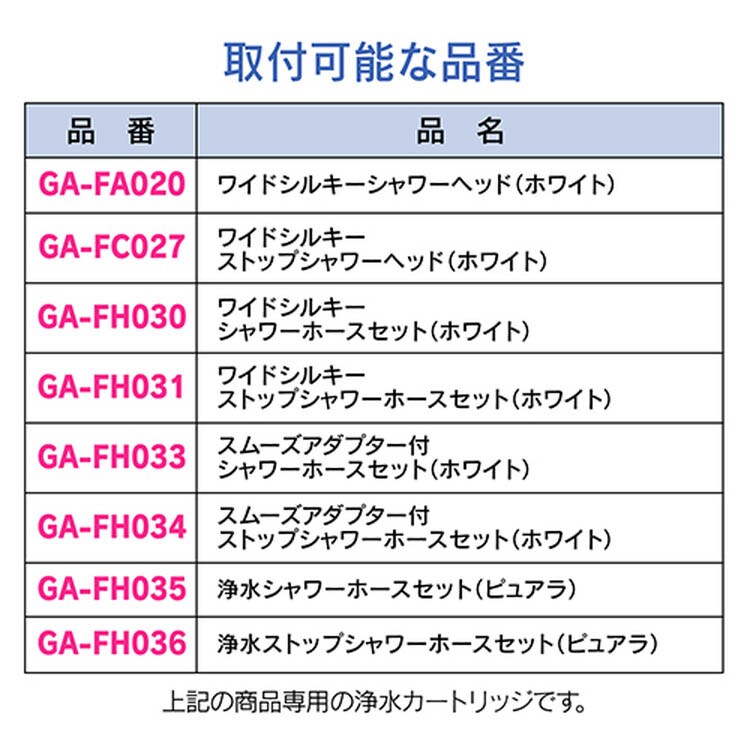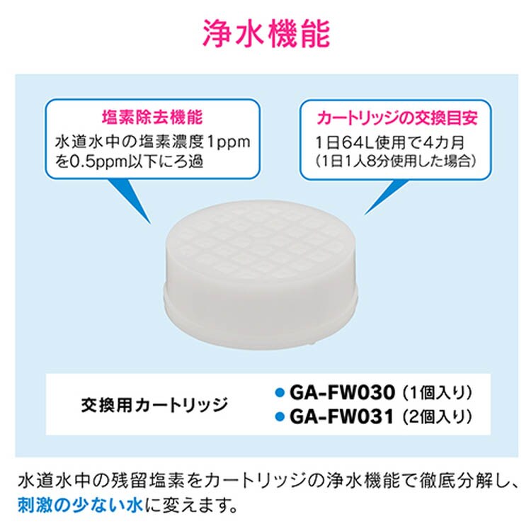 | ・カートリッジの交換目安:1日64L使用で4ヶ月(1日1人8分使用した場合) ・適合機種品番:GA-FA020・GA-FC027・GA-FH030・GA-FH031・GA-FH033・GA-FH034・GA-FH035・GA-FH036・357-900-W・357-910-W・357-915-W・357-916-S・357-916-B・357-916-P・357-905-W・357-906-S・357-906-B・357-906-P・357-921-MD・357-925-MM・357-925-MD・366-925-MM・366-925-MD ・入数:2個 ・使用温度:1~60度C ・使用圧力:0.05~0.75MPa ・材質:ポリプロピレン |