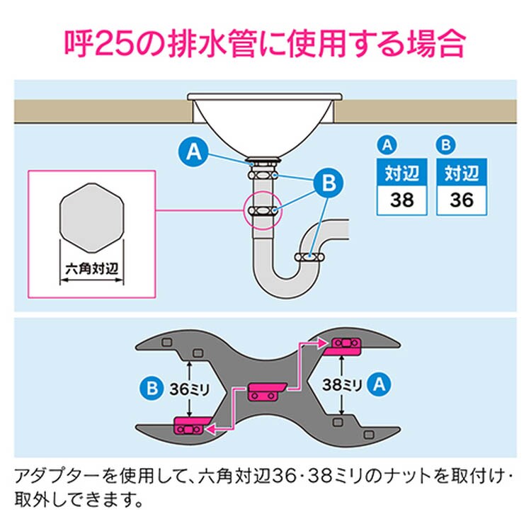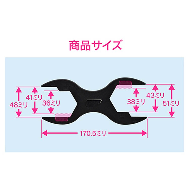 | 対応ナット(対辺):36mm・38mm・41mm・43mm・48mm・51mm。排水管たいへんレンチ全長:170.5mm。洗面用パイプクリーナーワイヤー長さ:0.7m。洗面用パイプクリーナーブラシ部サイズ:直径30mm×長さ40mm。洗面用パイプクリーナーワイヤー部樹脂コーティング。【材質】レンチ:ナイロン。パイプクリーナー:ポリプロピレン。パイプクリーナー:ポリエチレン・ステンレス。 |