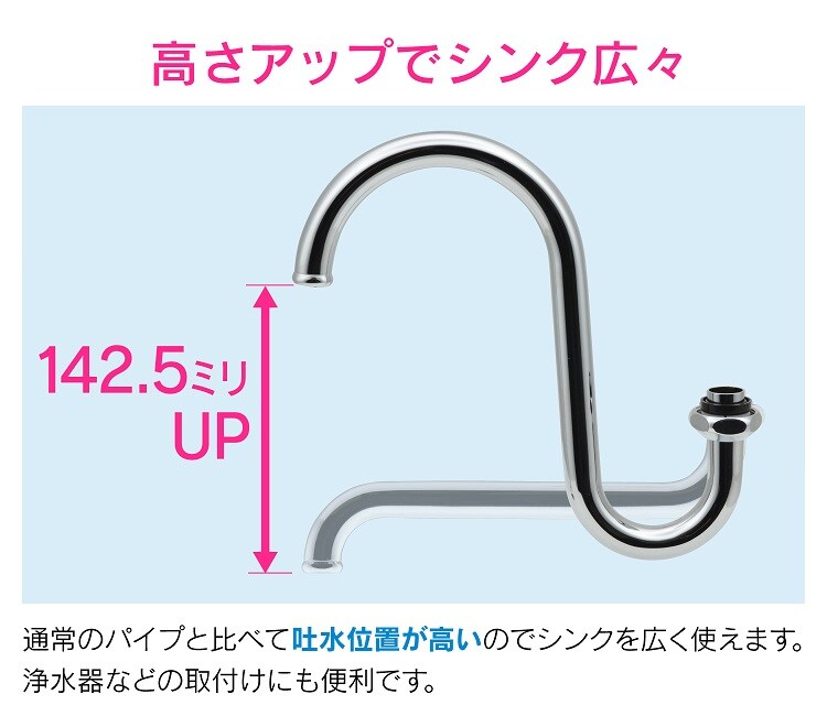 ●通常のパイプと比べて吐水位置が高いのでシンクを広く使えます。