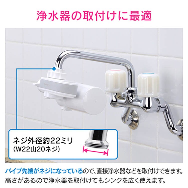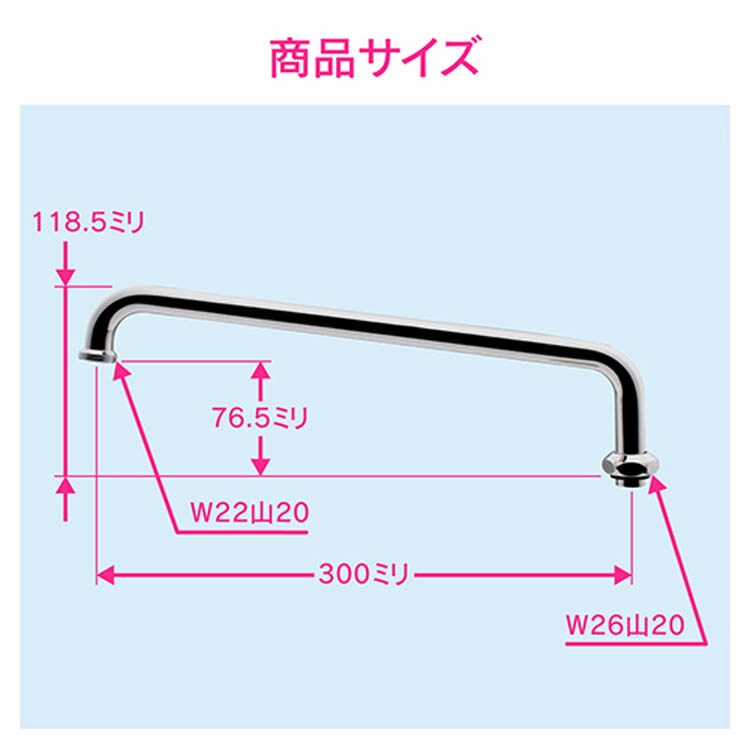 ●流し台を広く使うことができる、長さ300ミリのキッチン蛇口用交換パイプ。●パイプ先端がW22山20外ネジになっているので、直接浄水器などを取付けでき、高さがあるので浄水器を取付けてもシンクを広く使えます。●使用中のパイプ外径が16ミリであればどんな蛇口にも取付けできます。