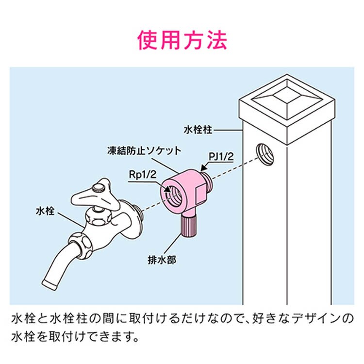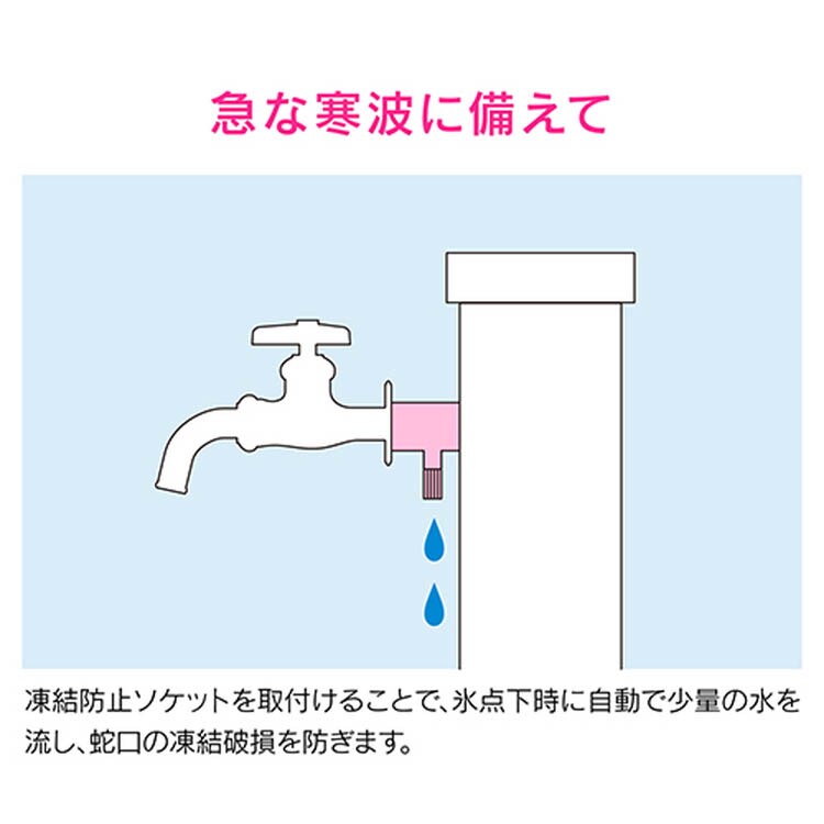 ●屋外にある水栓(蛇口)などの凍結を防止。●寒波対策の必需品です。●サーモエレメントを内蔵しており、周囲の温度が下がると少量の水を排出して自動で凍結を防ぎます。●呼び13の水栓の取付ネジの部分に取付けます。●水栓のデザインに関わらず、取付できます。●電源が不要なので、まわりにコンセントが無い屋外などに便利です。