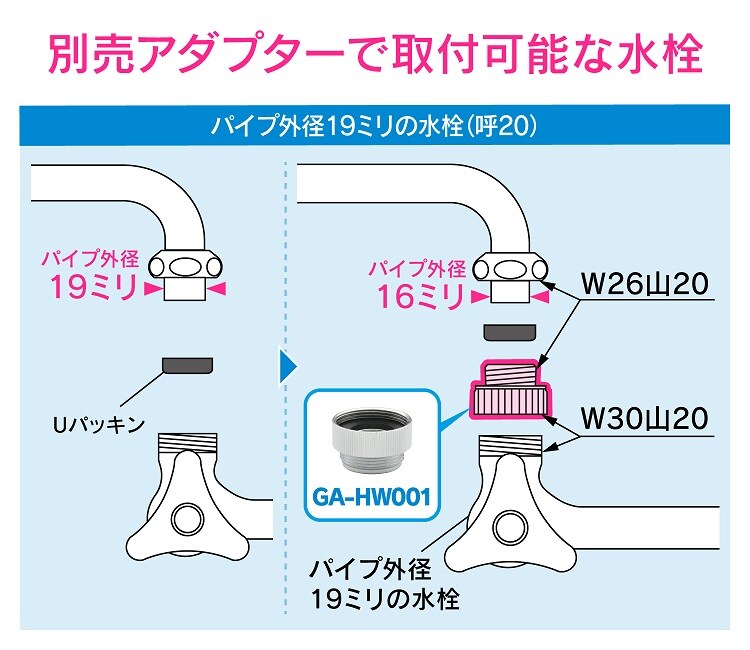 ●使用中のパイプ外径が16ミリであればどんな蛇口にも取付けできます。