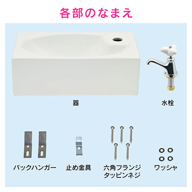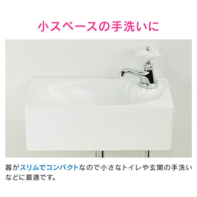 ●小スペースに適した壁掛手洗器と水栓のセット。●小スペースに適した陶器製の小型壁掛手洗器です。●スリムでコンパクトなので、トイレ・玄関の手洗いなどに最適です。●25ミリ規格の排水金具と組み合わせてください。●壁掛用のバッグハンガー(取付金具)付きです。●陶器製ハンドル付きの立水栓です。