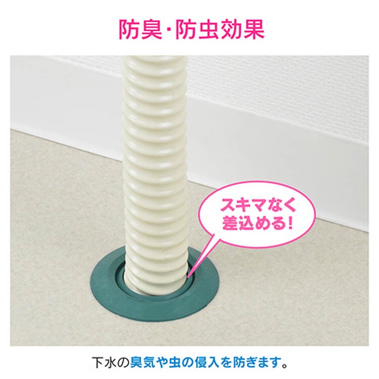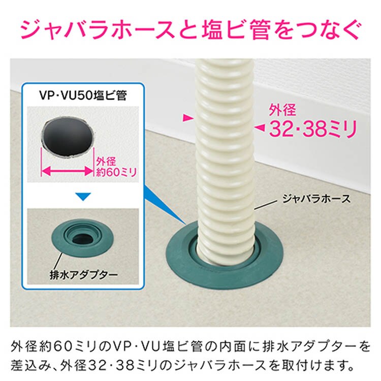 ●床・壁面の排水用呼50塩ビ管とジャバラホースをつなぐアダプター。●VP・VU塩ビ管どちらにも使用できます。●スキマなく差し込め、下水の臭気や虫の侵入を防ぎます。●外径約60ミリのVP・VU塩ビ管の内面に排水アダプターを差込み、外径32・38ミリのジャバラホースを取付けます。