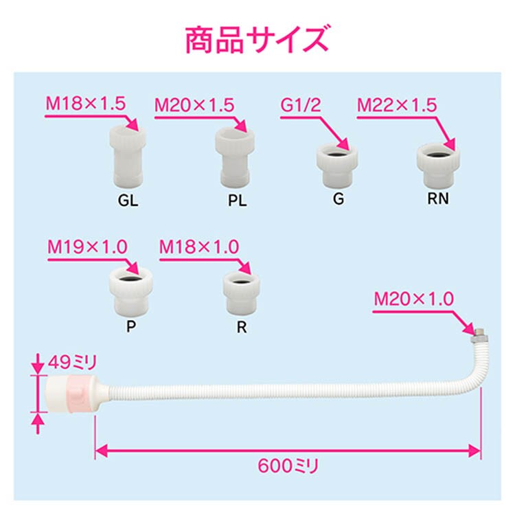 | サイズ:長さ600mm・ネジM20×1.0。アダプタサイズ:(GL)M18×1.5・PL)M20×1.5・(G)G1/2・(RN)M22×1.5・(P)M19×1.0・(R)M18×1.0。アダプタ対応:パロマ・リンナイ・大阪ガス(ハーマン)・東京ガス。アダプタ対応:東邦ガス・ナショナル・東芝・三洋・三菱。【材質】ステンレス。ポリエチレン。黄銅・ABS樹脂・ポリアセタール。 |