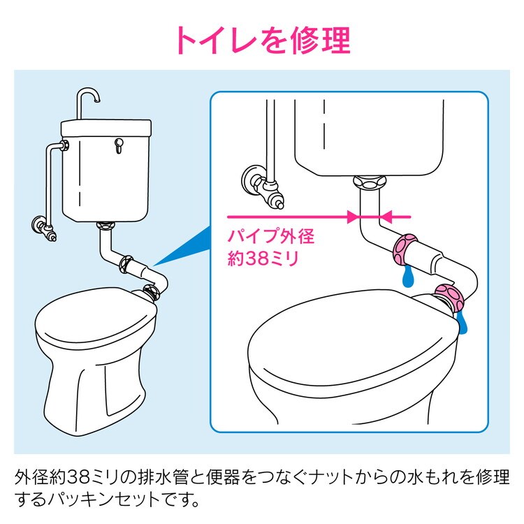 ・ロータンクと便器をつなぐ排水パイプナット部からの水もれを補修するパッキンセット。