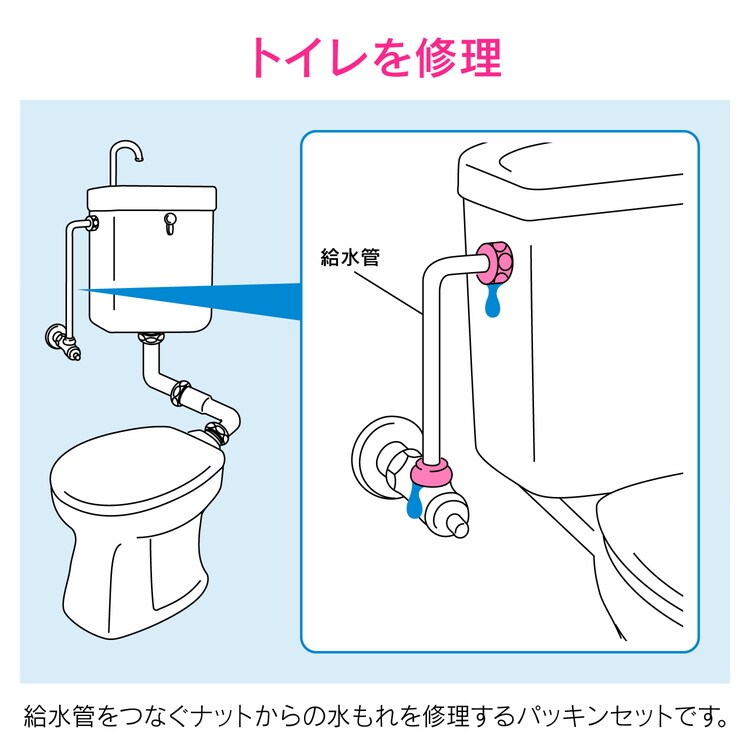 | (用途) ・給水管ナット部の水もれを補修するパッキンセット。 (仕様) ・管外径約13mmの給水管用。 ・入数:10セット。 |