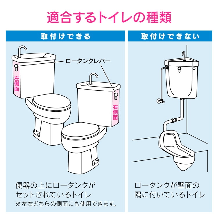 ●左右サイドにレバーが付いたロータンクとレバーがセットされた(密結型)トイレに取付けできます。