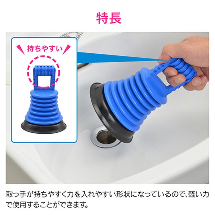 ●排水口のつまり解消用ラバーカップ。●強力な吸引力と圧力で汚物を簡単に取除きます。●従来型のスポイドゴムに比べて、コンパクトで保管しやすいです。●取っ手がもちやすく力を入れやすい形状になっているので、軽い力で使用することができます。●洗面化粧台、洗面器、手洗器などの排水口に使用できます。
