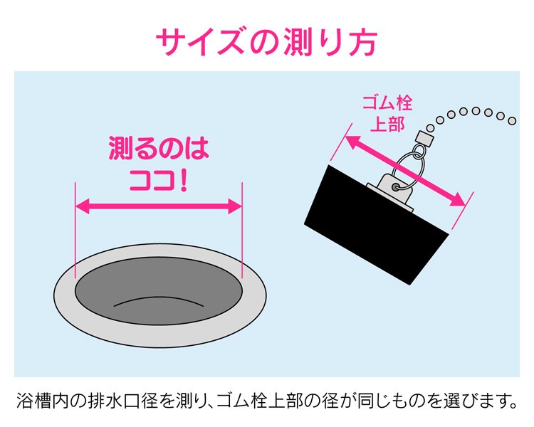 ・浴槽の排水口径を測り、ゴム栓上部の径が同じものを選びます。