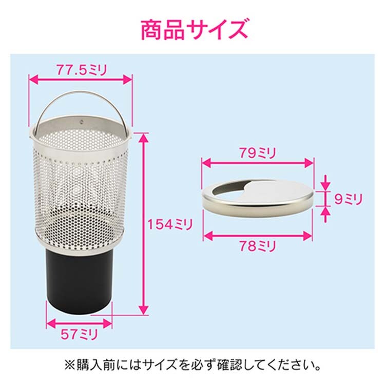 | ゴミカゴサイズ:上部直径77.5(下部直径57)×高さ154mm。排水プレートサイズ:上部直径79(下部直径78)×高さ9mm。使用温度:1~60度C。【材質】ゴミカゴ:ステンレス。ゴミカゴ:ポリプロピレン。排水プレート:ステンレス。 |