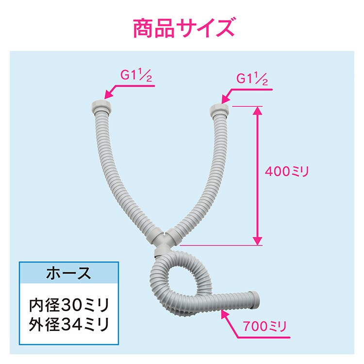 | ホース径:内径30mm*外径34mm ホース長さ:0.4*0.4*0.7m 取付ネジサイズ:G1・1/2 使用温度:1~60度 |