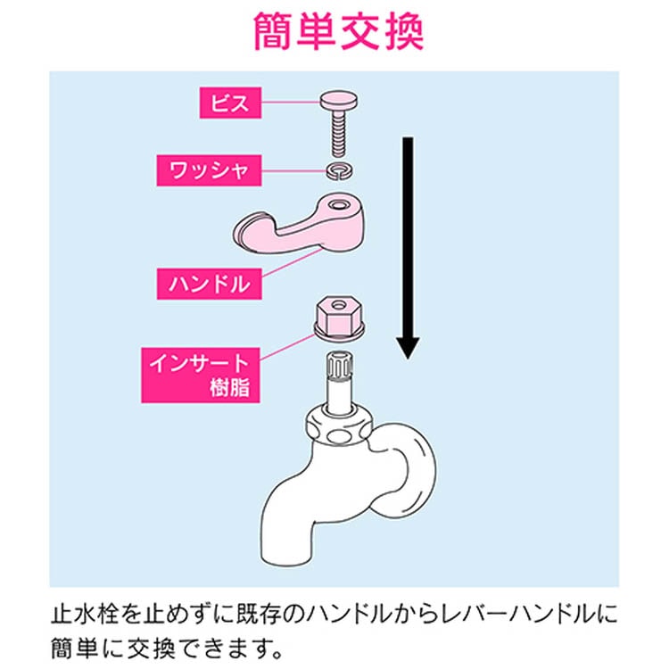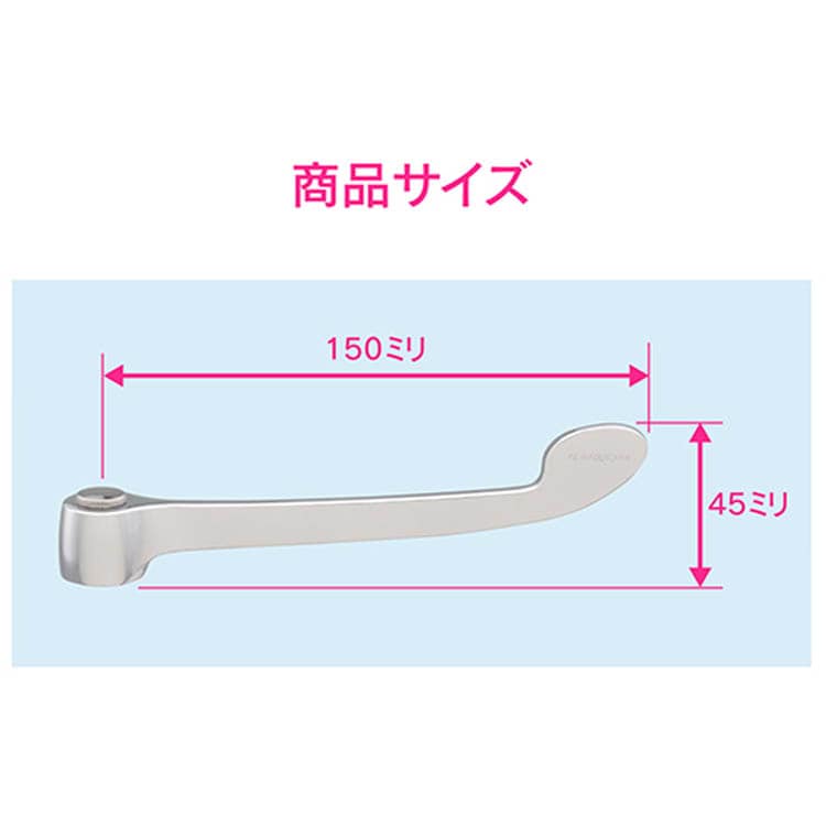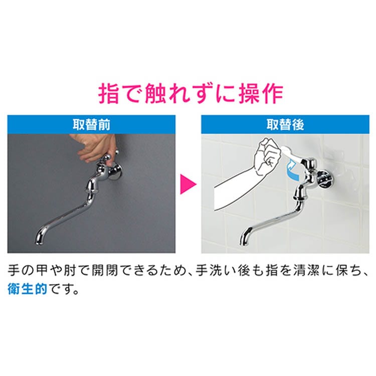 ●交換用ロングレバーハンドル。●軽い力で開閉でき、ハンドル操作が楽になります。●ハンドルが壁にあたり吐水量を制限するので、簡単に節水することができます。●指で触れずに手の甲や肘で開閉できるので、手洗い後も指を清潔に保てるため、大人数が使用する学校や施設に最適です。●各メーカーに対応したアダプターとビスがついているので、ほとんどの水栓に取付けることができます。