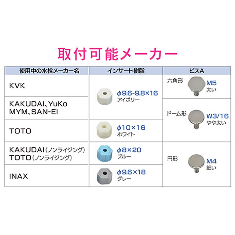 | ハンドル長さ:150mm。取付可能メーカー・使用インサート樹脂・使用ビスA:KAKUDAI・径9.6-9.8X16アイボリー・ドーム形W3/16。取付可能メーカー・使用インサート樹脂・使用ビスA:KVK・径9.6-9.8X16アイボリー・六角形M5。取付可能メーカー・使用インサート樹脂・使用ビスA:TOTO・径10X16ホワイト・ドーム形W3/16。取付可能メーカー・使用インサート樹脂・使用ビスA:INAX・径9.6X18グレー・円形M4。取付可能メーカー・使用インサート樹脂・使用ビスA:Yuko/MYM/SAN-EI・径9.6-9.8X16アイボリー・ドーム形W3/16。取付可能メーカー・使用インサート樹脂・使用ビスA:KAKUDAI(ノンライジング)/TOTO(ノンライジング)・径8X20ブルー・円形M4。【材質】亜鉛。黄銅。 |