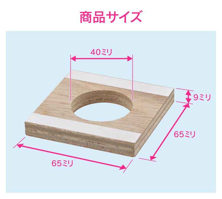 | ・取付穴径40mm用 ・サイズ:65*65*厚さ9mm*穴径40mm ・材質:ラワン合板 |