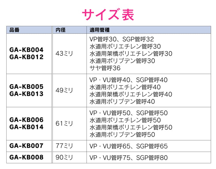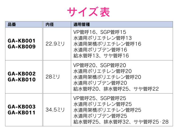 ・適用管種:VP管呼20・SGP管呼20・水道用ポリエチレン管呼20・水道用架橋ポリエチレン管呼20