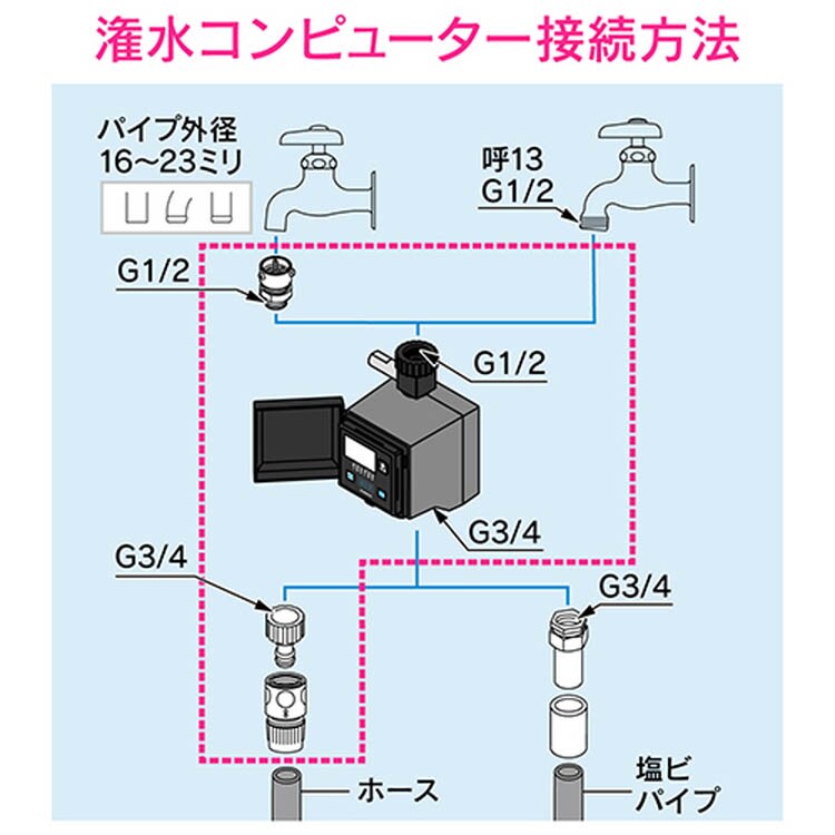 ●蛇口に取付け、時間などを設定しておくと自動で水やりを行うタイマー。●外径16~23ミリの吐水口や、呼13のカップリング付水栓(取付対応ネジG1/2)に取付けできます。●あらかじめ設定しておいた時刻になると指示された時間通水することで、水やりの手間が解消され、外出時なども安心です。●水やり設定をした時刻以外でも「手動水やり」ボタンでいつでも水やりが可能です。●凍結防止ユニットつきで、ユニット内部のSMA(形状記憶合金)バネの働きで、本体内温度が約2度Cになると開弁し、少量の水を排出して自動で凍結を防ぎ、約6度Cで閉弁します。●潅水コンピューター本体から操作ユニットが取り外せますので、別の場所であらかじめ水やり設定をしておくことができます。