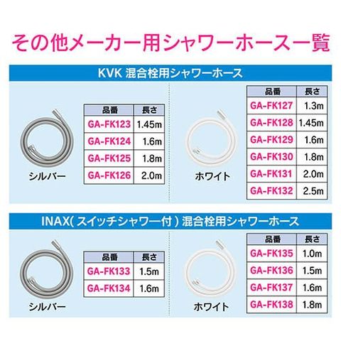 | 使用温度:1~60度 使用圧力:0.05~0.75MPa 色:ホワイト 取付ネジサイズ:W24山20(混合栓側)・G1/2(シャワーヘッド側) (材質)ポリ塩化ビニル樹脂・黄銅 |