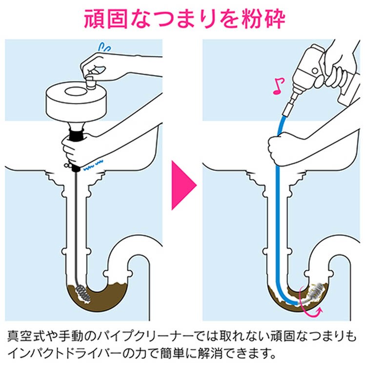 ●真空式や手動回転式では取れない頑固な配管のつまりも、電動ドリルの強い力で楽に洗浄できます。