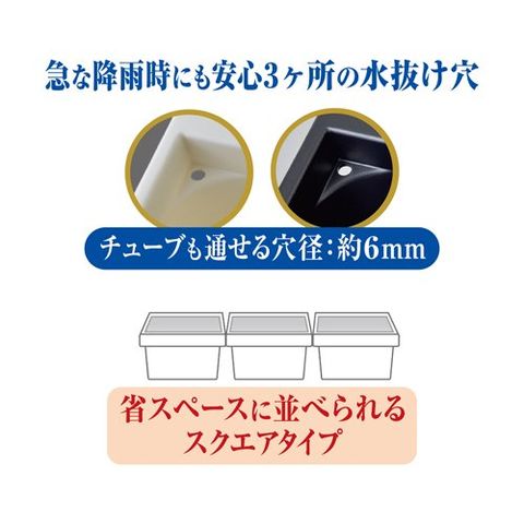 ●急な降雨時に稚魚や親魚を守る3ヶ所の水抜け穴構造で、屋外でも安心して飼育ができます。