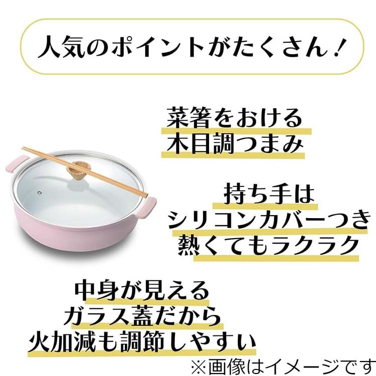 | 本体サイズ:262×210×105mm(満水:1.9L、深さ:66mm) 素材:表面加工/内面:セラミックコーティング、外面:焼付塗装 材質/本体:アルミニウム合金、はり底:18-0ステンレス(底の厚さ:2.3mm)、取手カバー:シリコーン樹脂、フタ:全面物理強化ガラス、つまみ:フェノール樹脂(木目調シリコーンコーティング) |
