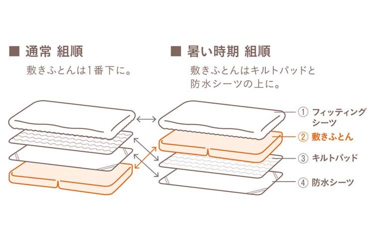 ・暑い時期は、敷きふとんをキルトパッドと防水シーツの上に組み替えることで、赤ちゃんの快適な眠りをサポートします。