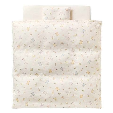 | (1)羽毛掛ふとん 側地:ポリエステル85%・綿15% 詰めもの:ダウン85%・フェザー15% サイズ:約70×70cm (2)掛ふとんカバー 吸水速乾性Wガーゼ(組成)綿100% サイズ:約73×73cm (3)敷ふとん(組成) 側地:ポリエステル100% 中材:ポリエーテルエステルエラストマー サイズ:約46×78cm (4)フィッティングシーツ 吸水速乾性Wガーゼ(組成)綿100% サイズ:約48×78cm (5)まくら(組成) 側地:綿100% 詰めもの:ポリエステル100% サイズ:約20×28cm (6)まくらカバー 吸水速乾Wガーゼ(組成)綿100% サイズ:約22×30cm (7)防水シーツ(四隅ゴム付) (組成)綿80% ポリエステル20%(ポリウレタンラミネート加工) サイズ:約46×78cm (8)キルトパッド(組成) 表地:パイル糸 綿100% 地糸 ポリエステル100% 裏地:綿100% 詰めもの:ポリステル100% サイズ:約46cm×78cm |