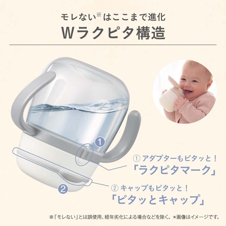 ●漏れない!※「Wラクピタ構造」。「印に合わせてアダプターを締める」「フタを閉じる」それだけで漏れないを実現。