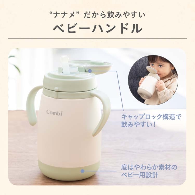 ●ナナメだから飲みやすい「ベビーハンドル」。持ちやすさを考えた末たどり着いた飲めるカタチ。
